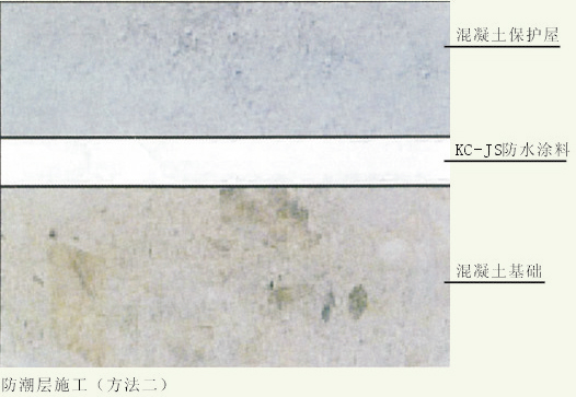 方法二:在混凝土基面上涂刷1.5~2mmKC-JS聚合物防水涂料。適用范圍廣,在一些有障礙物或基面不平整地面均可使用。然后再做保護(hù)層。